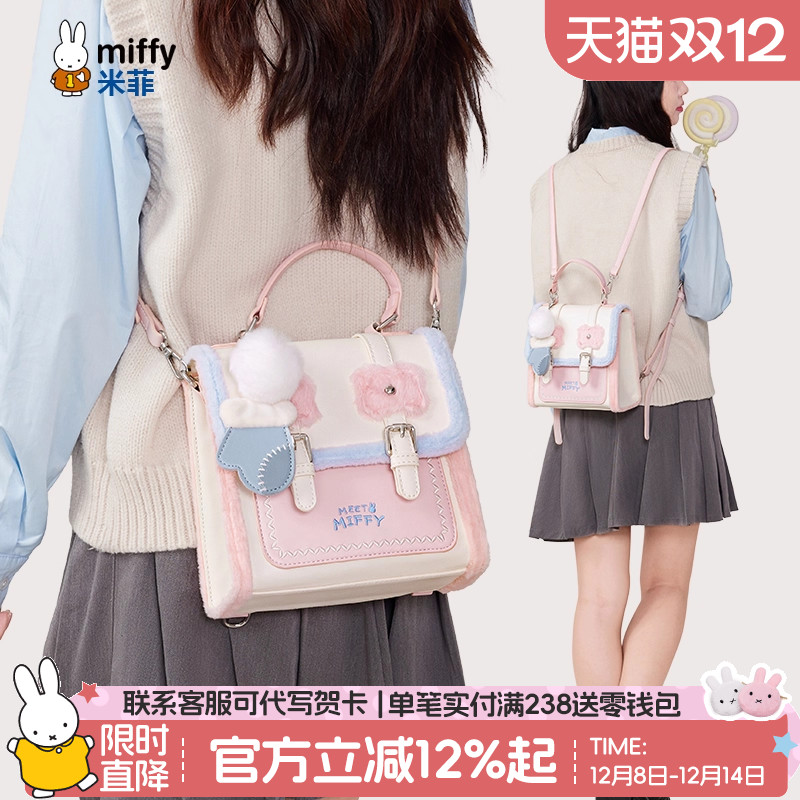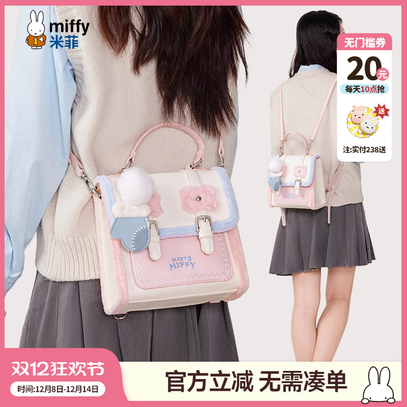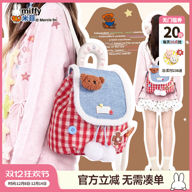 米菲格纹双肩包2025年新款可爱毛绒手提包卡通甜美少女小背包书包