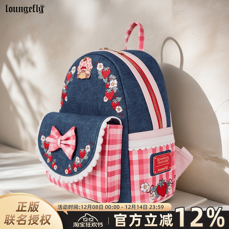 Loungefly草莓甜心牛仔粉红格纹正版周边甜美双肩包女孩迷你背包