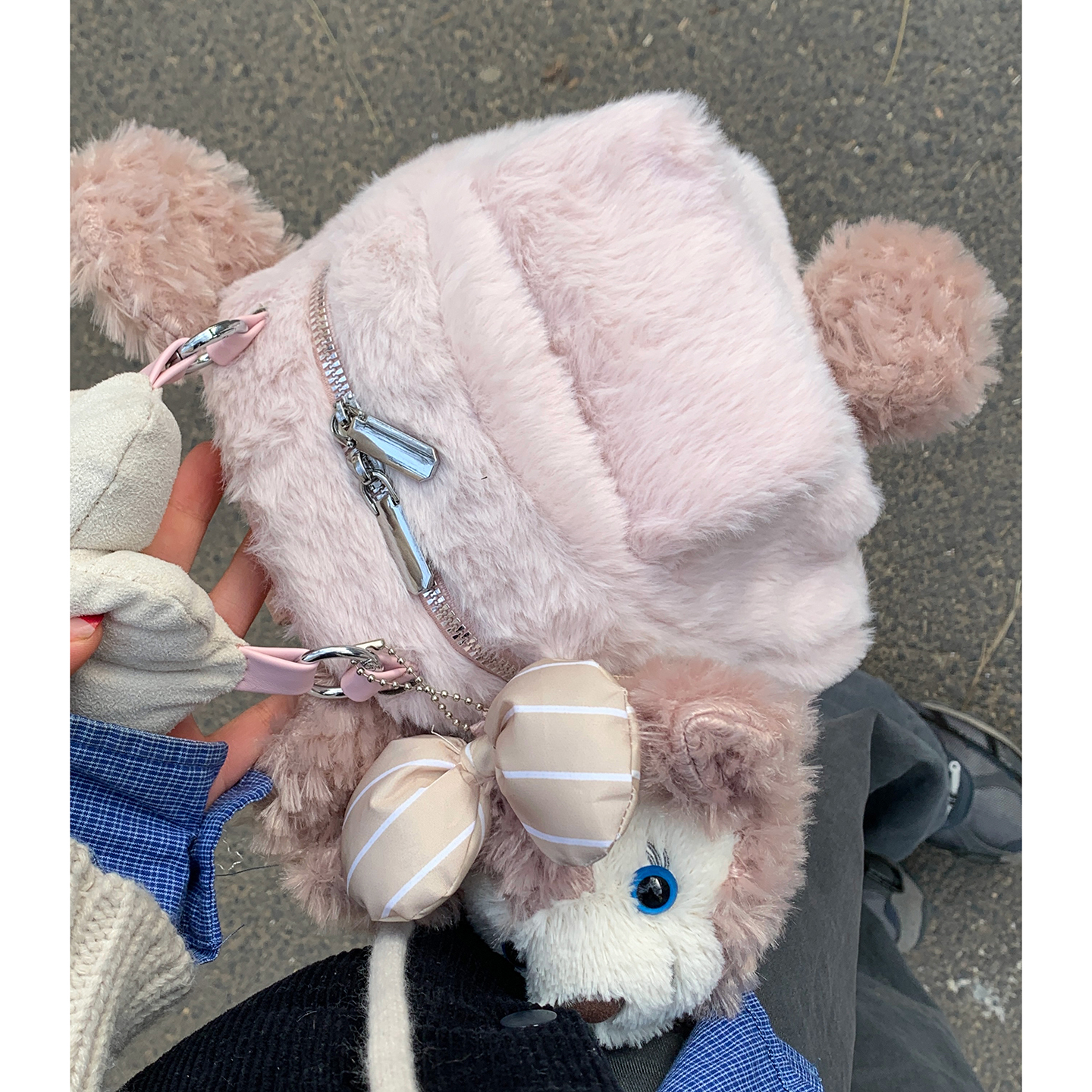 可爱毛绒包包女2025新款潮时尚学院风双肩背包甜美蝴蝶结毛毛包