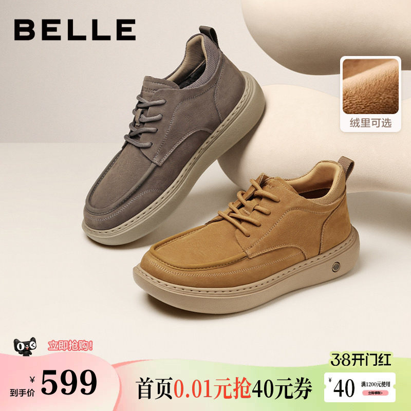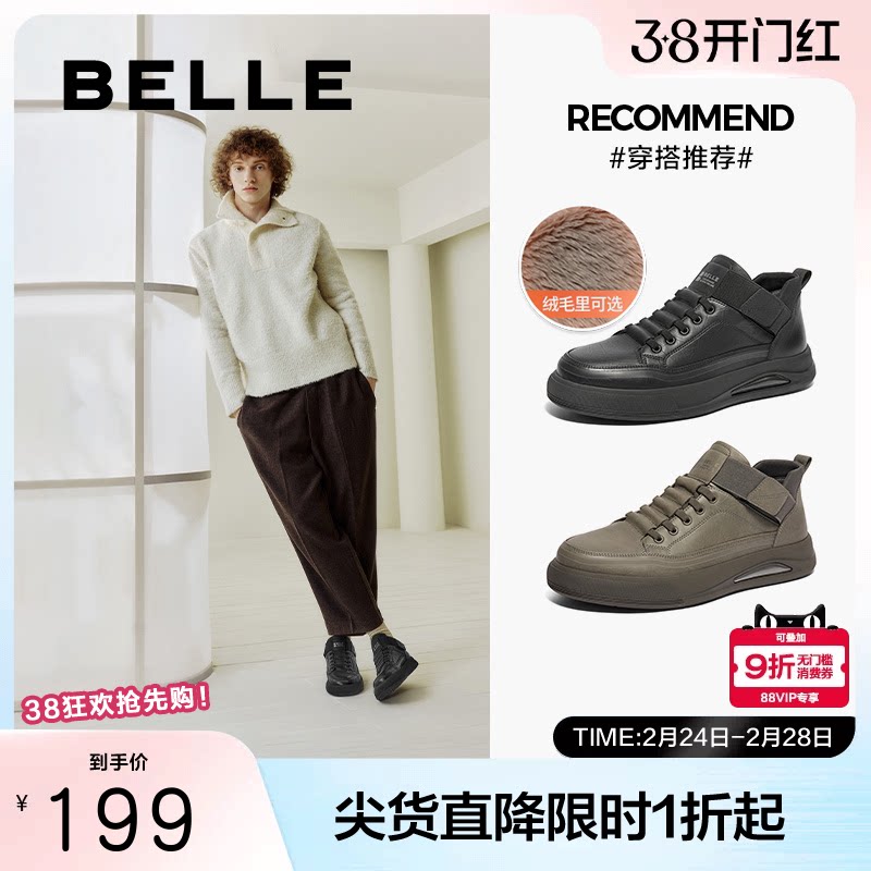 百丽男士高帮休闲工装板鞋男冬季新款牛皮厚底增高加绒棉鞋保暖靴
