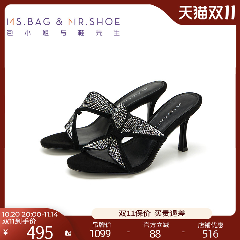 包小姐与鞋先生2025年夏季新款条带立体烫钻细高跟拖鞋女252418