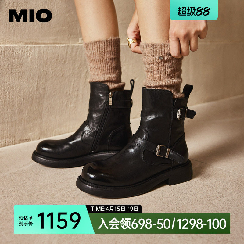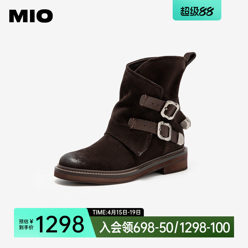 MIO米奥西部靴2025冬季新款圆头粗跟中筒搭扣切尔西靴复古女靴
