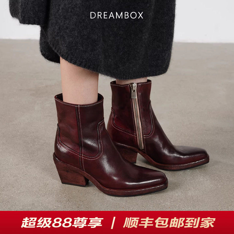 DREAMBOX钧博粗跟气质女靴水洗马皮尖头切尔西靴厚底增高洋气靴子