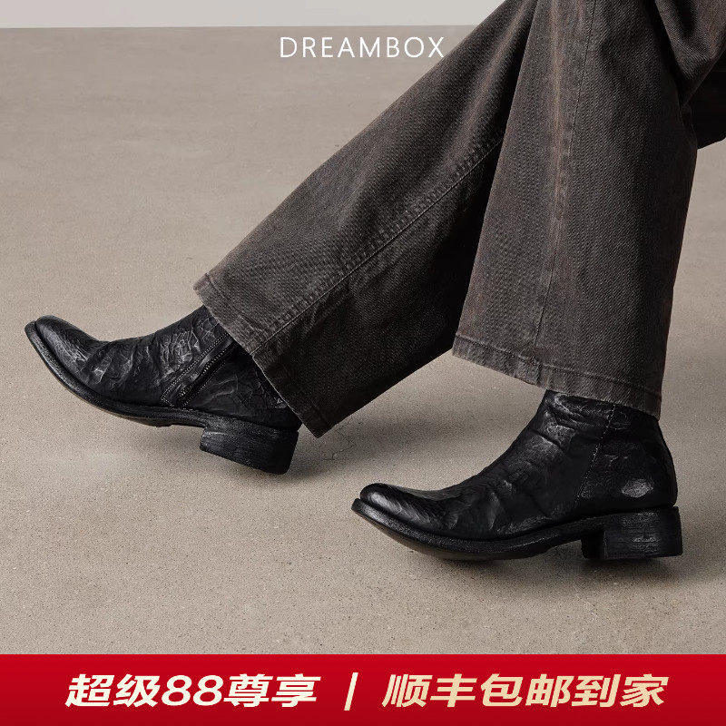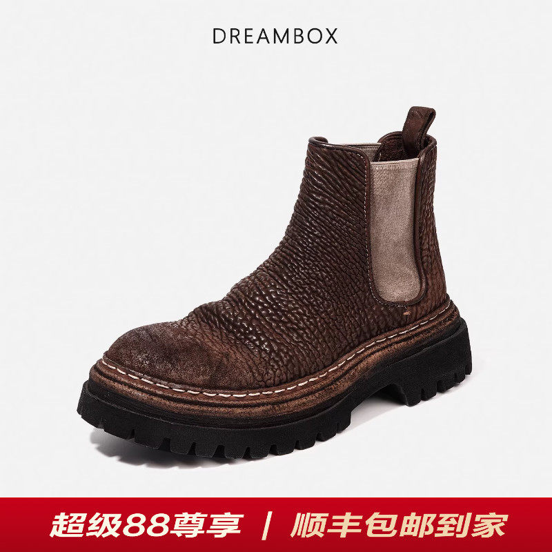 【粗跟厚底5cm】dreambox钧博缩纹马臀皮切尔西靴手工固特异短靴