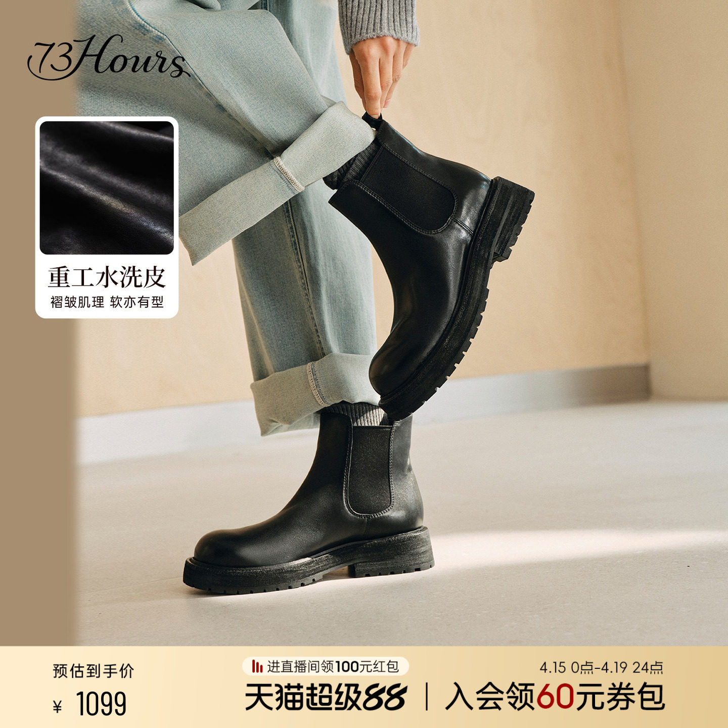 73hours女鞋加州日常冬季新款水洗皮切尔西靴女粗跟西部短靴