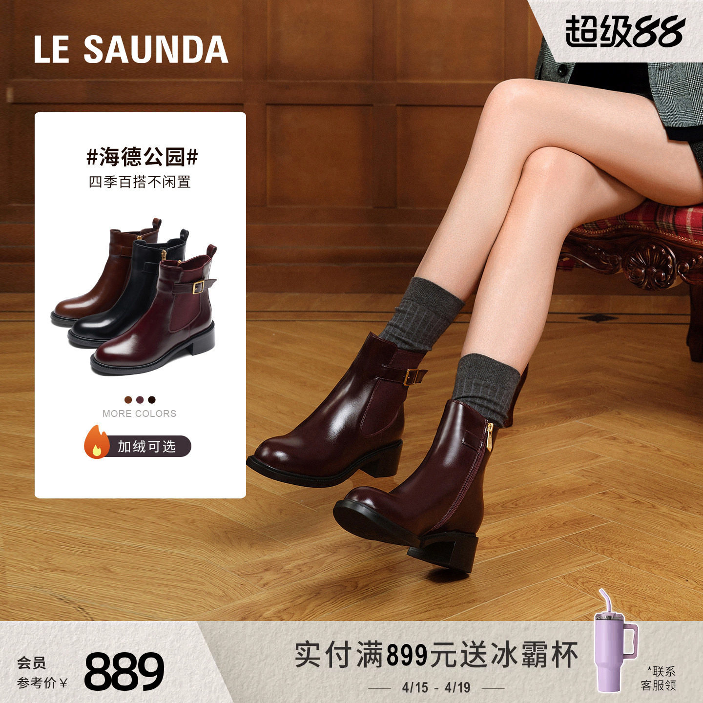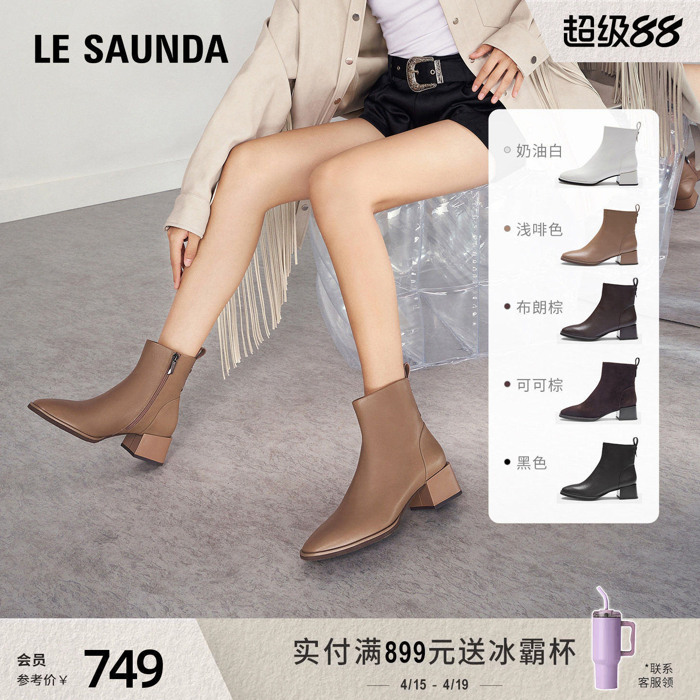 莱尔斯丹奶油乳酪新款粗跟真皮加绒切尔西瘦瘦靴短靴子女鞋44906