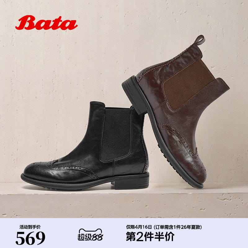 Bata切尔西靴女冬季新款英伦风切尔西粗跟通勤短筒靴68151DD5