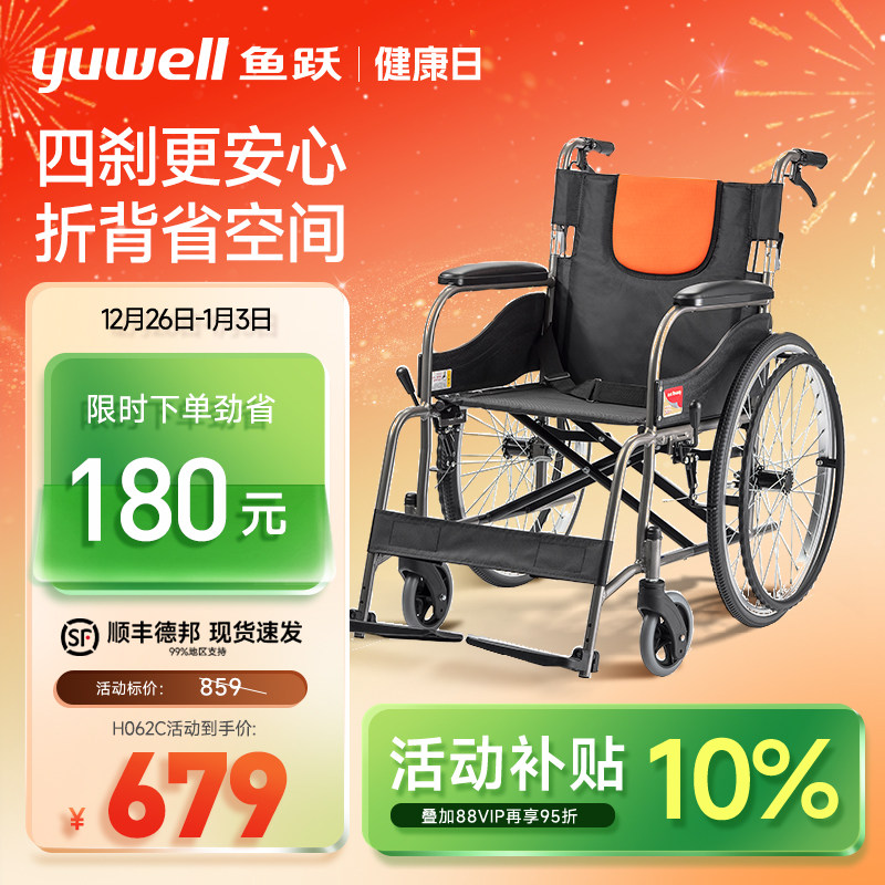 鱼跃轻型轮椅车折叠轻便老人专用多功能残疾人代步手动推车H062C