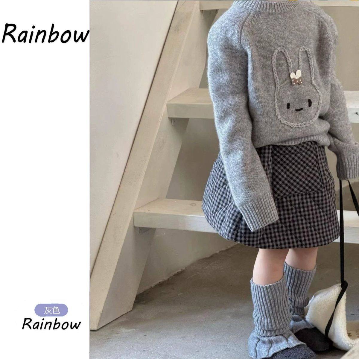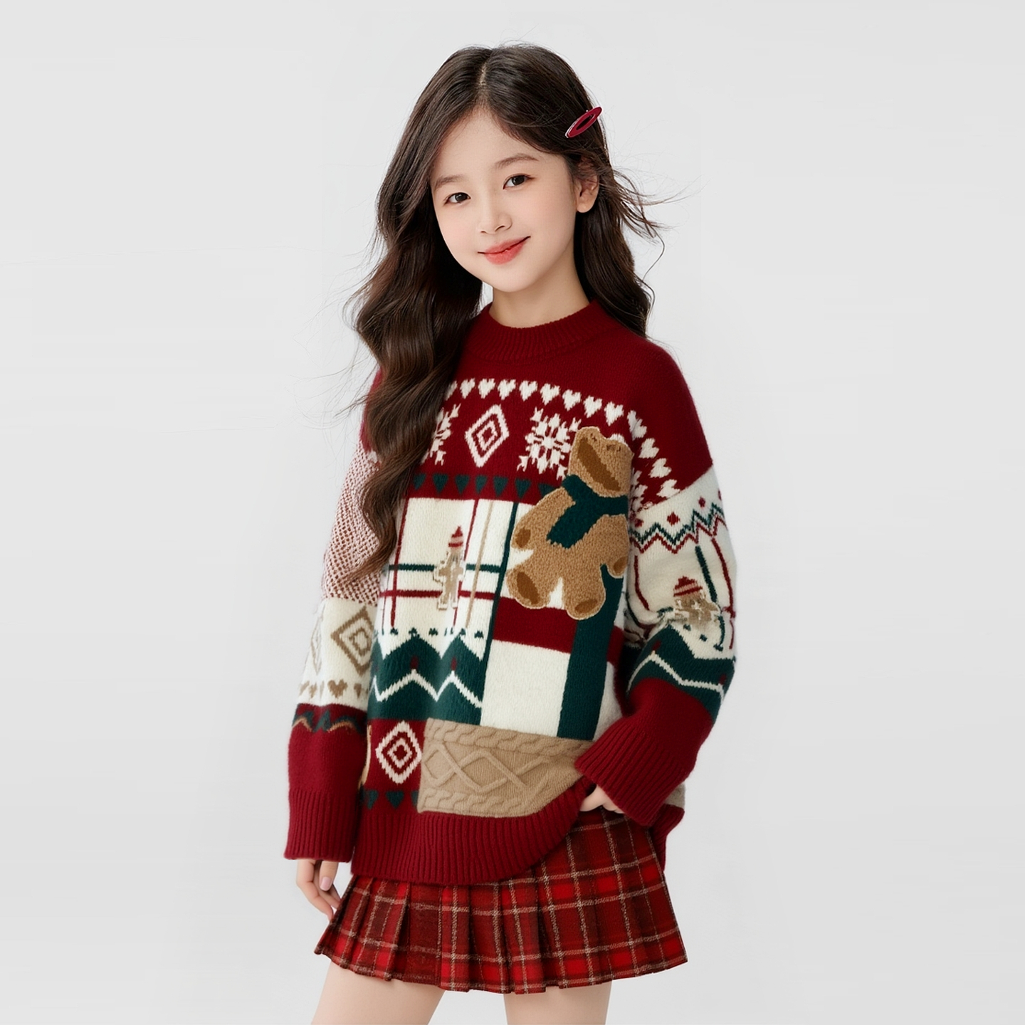 圣诞风女童加厚红色小熊毛衣费尔岛针织衫2025秋冬款格子呢半身裙