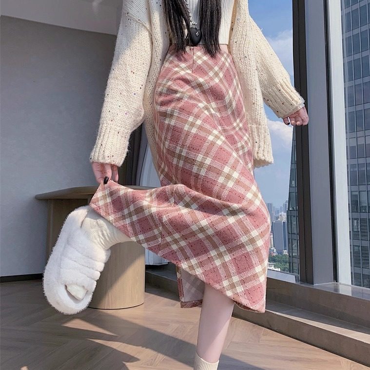 甜美粉色格子毛呢包臀半身裙女秋冬款韩系超好看后开叉直筒a字裙