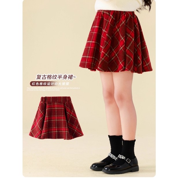 女童裙子红色冬装儿童格子半身裙秋冬款伞裙加厚女孩短裙冬季洋气
