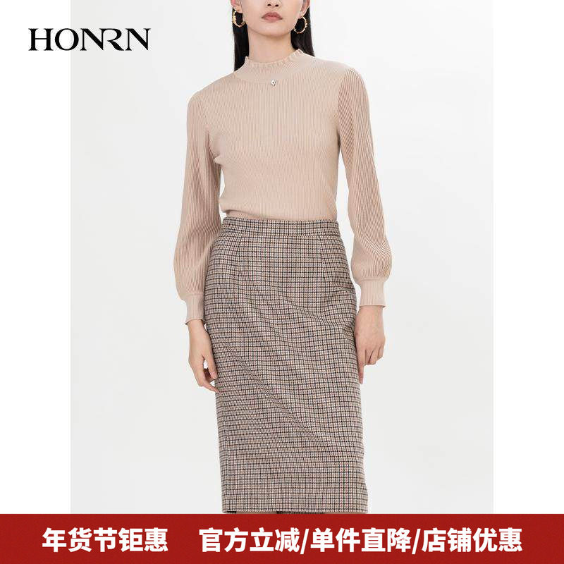 HONRN/红人格纹格子裙子羊毛呢子直筒半身裙女秋冬款HH55OQ719