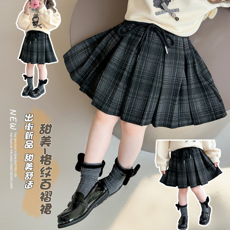 女童半身裙百褶裙秋冬款儿童裙子洋气女孩磨毛格子裙短裙春季童装