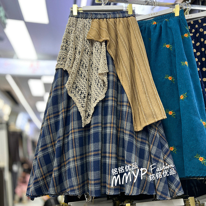 日系复古不规则拼接格子半身裙女秋冬款格纹毛呢伞裙显瘦a字长裙