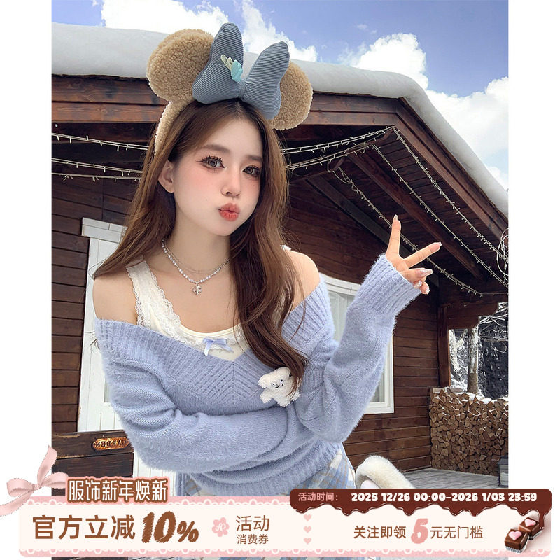 织物猪 椰奶少女 软糯一字领露肩毛衣女秋冬蕾丝千金感纯欲针织衫