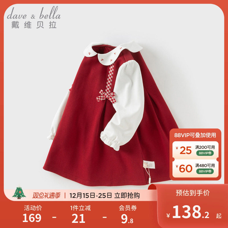 戴维贝拉女童连衣裙春装儿童新年红色公主裙周岁女宝礼服裙子洋气