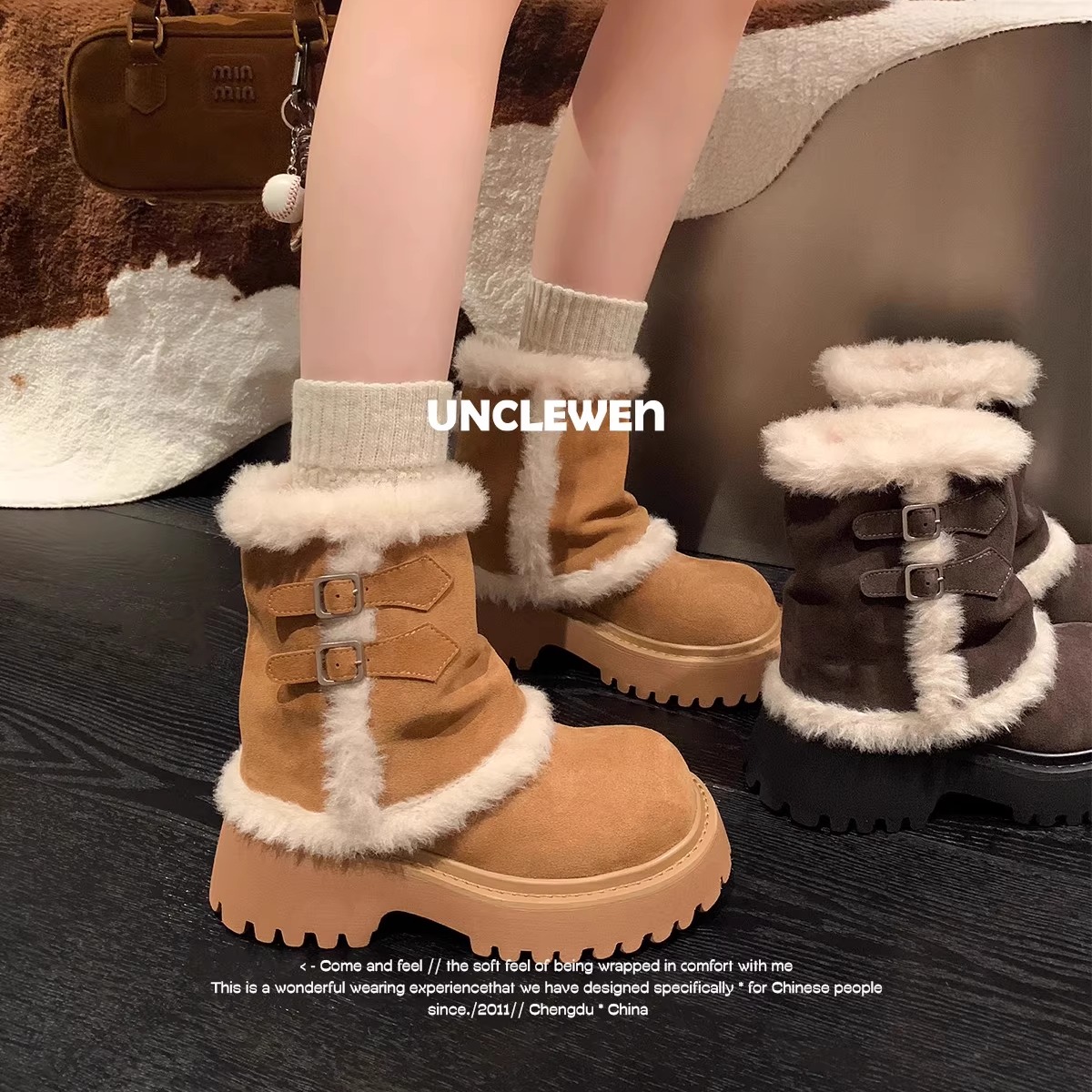澳洲羊皮毛一体灰色扣带厚底毛毛翻边保暖棉鞋中长筒雪地靴女冬季