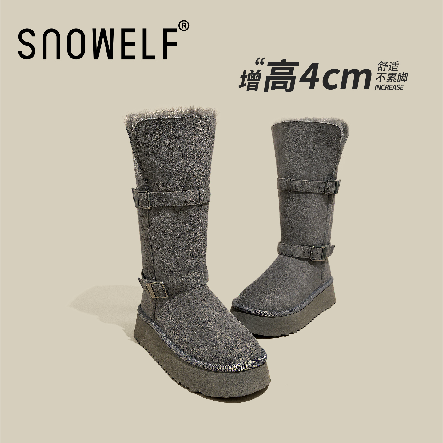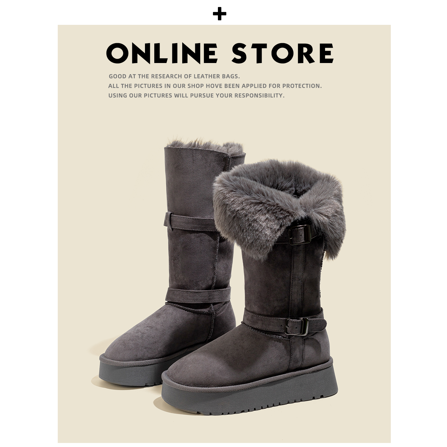 厚底两穿灰色长筒雪地靴女2025冬新款皮带扣毛毛翻边保暖高筒棉鞋