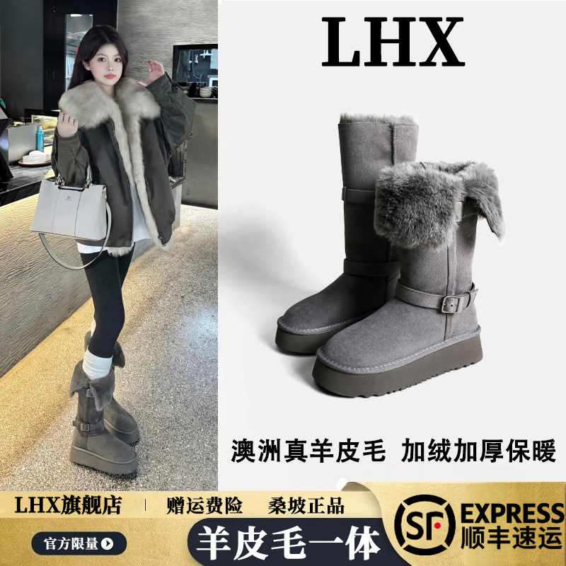 澳洲进口羊皮毛一体灰色长筒雪地靴女款2025冬季时尚厚底保暖靴子