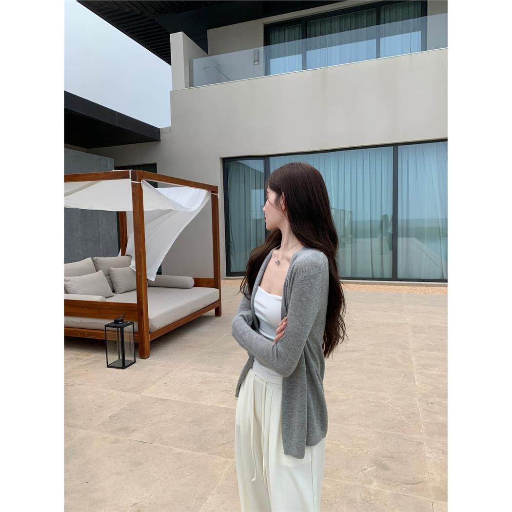 2023春夏新款V领羊毛开衫女中长款宽松精纺超薄针织衫防晒衫外套