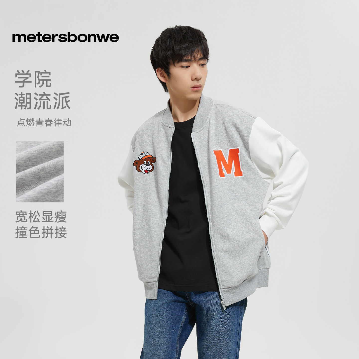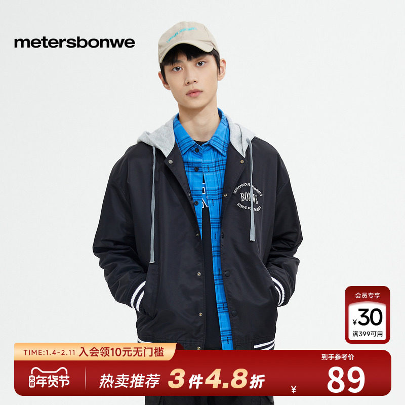 美特斯邦威棒球服夹克休闲外套男款春秋季时髦连帽单排扣撞色开衫