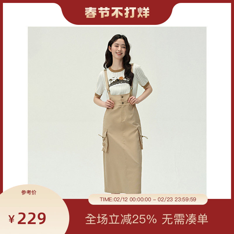 固执春季新款复古学院纯色背带中长款a字半身裙00031BQ07775