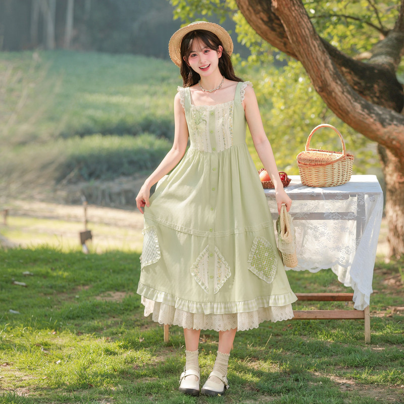 森女部落原创2026年新款连衣裙a字背带裙蕾丝花边飞飞袖春夏新款