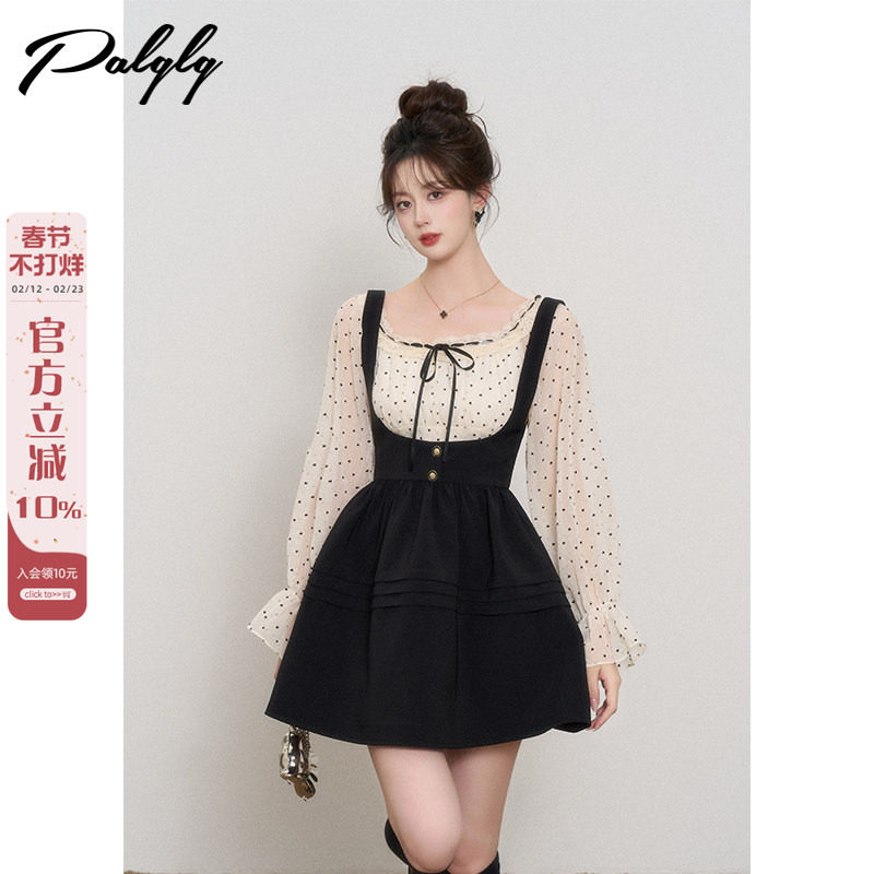 波点衬衫背带连衣裙两件套女秋季高级感法式千金风蓬蓬a字裙套装