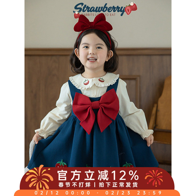 幼悠 女童2026春秋套装儿童草莓刺绣娃娃翻领衬衫A字裙摆背带裙潮