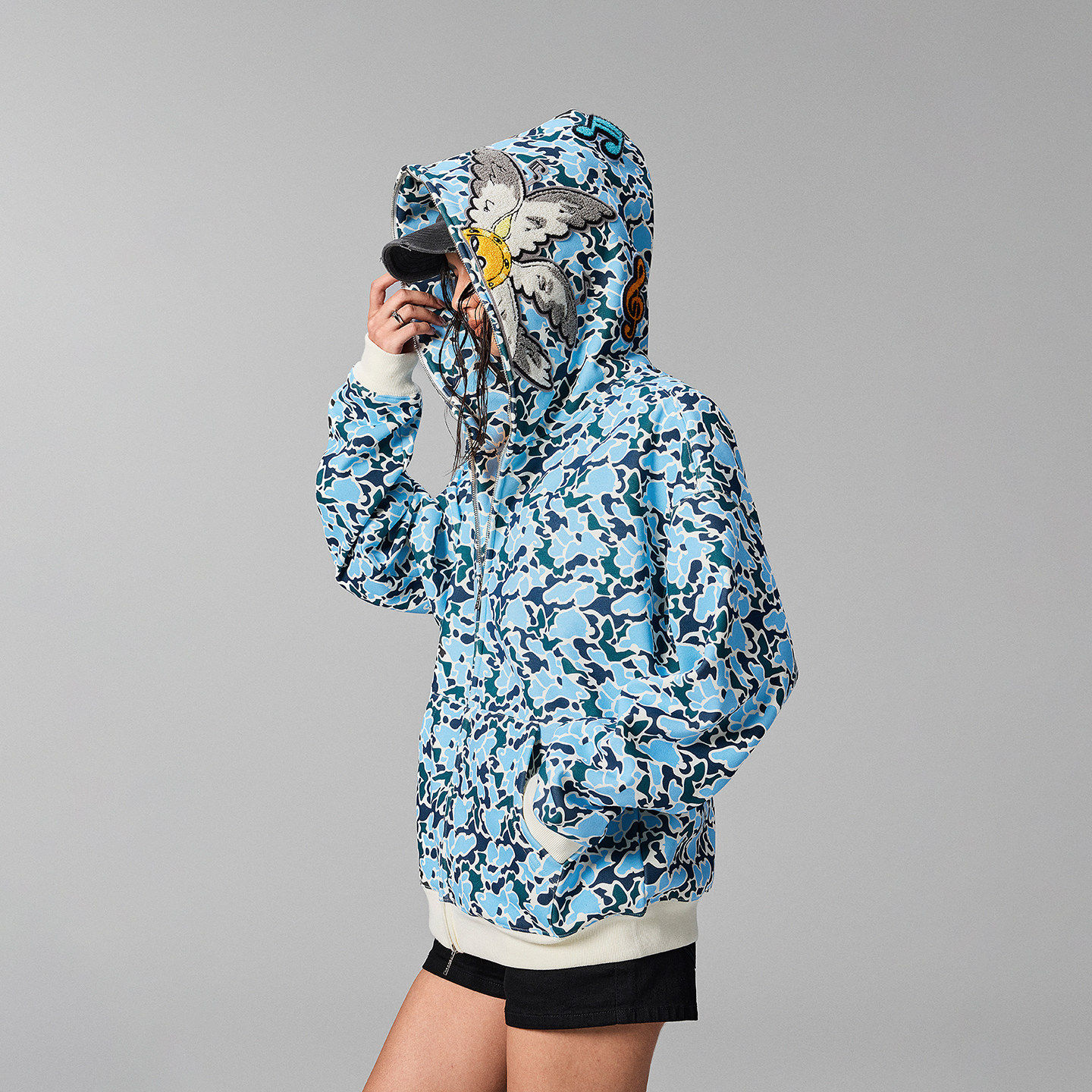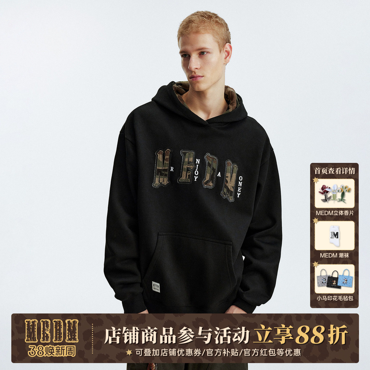 MEDM 帽里迷彩贴布休闲连帽卫衣秋冬美式套头帽衫情侣加绒外套男