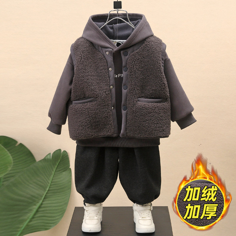 男童加绒套装秋冬2025新款儿童羊羔绒加厚马甲冬装宝宝卫衣三件套