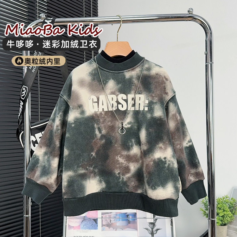 男童秋冬加绒卫衣2025新款迷彩纯棉一体绒套头衫儿童春秋连帽上衣