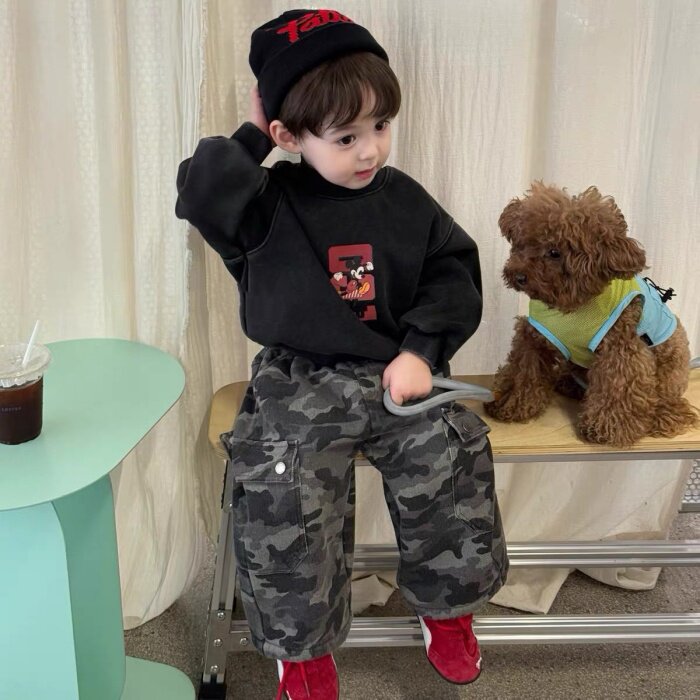 儿童韩版男女童加绒加厚套头卫衣宝宝做旧炒色上衣加绒迷彩直筒裤