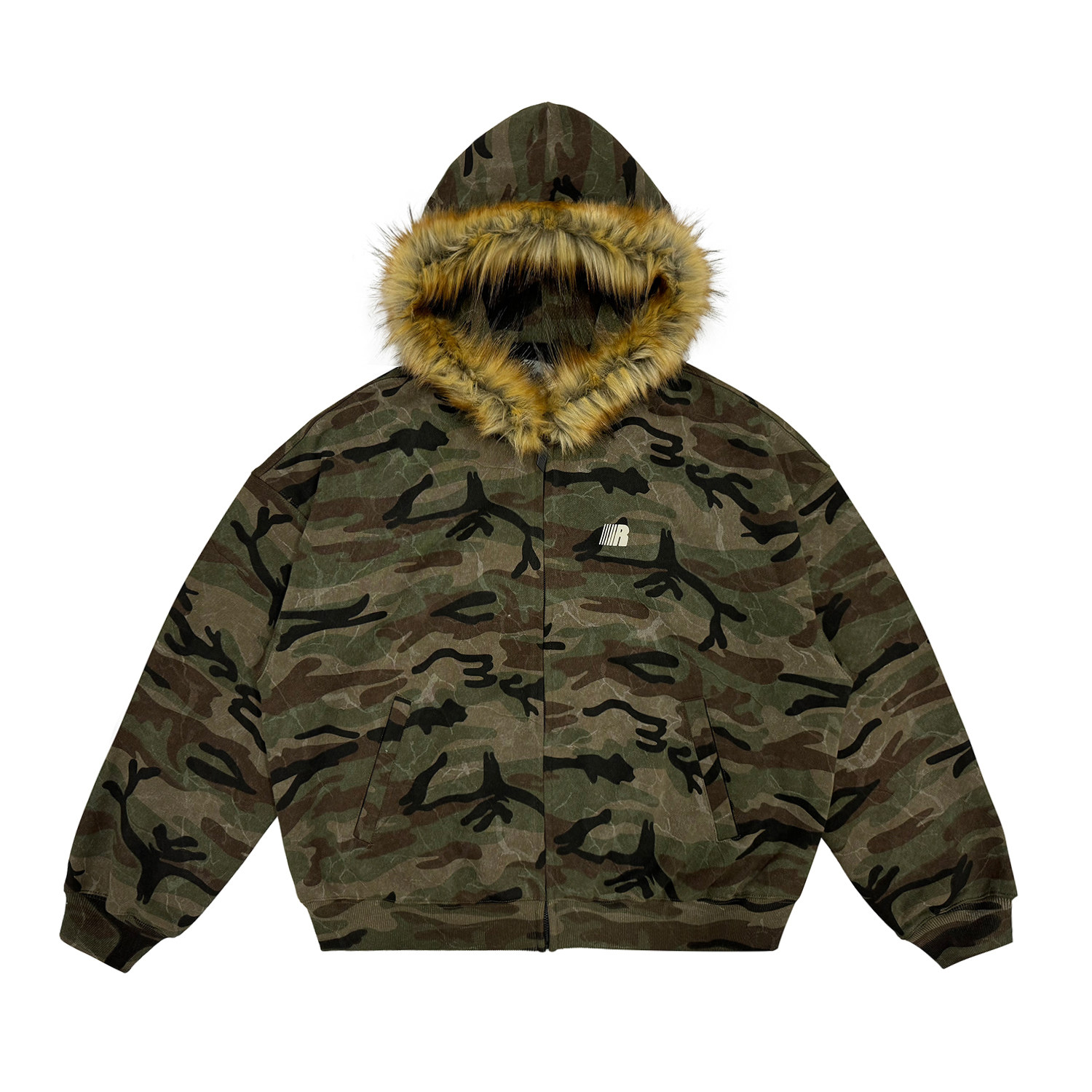 FDR官方店 R字毛领迷彩加绒连帽卫衣外套男女秋冬季加厚美式上衣