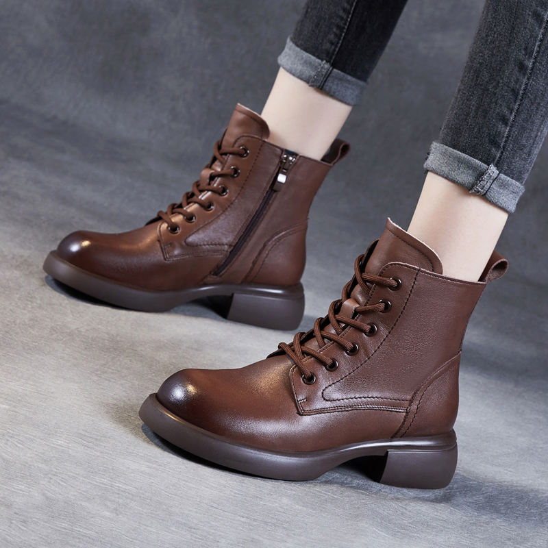 女子款真皮短靴女冬季单靴2025新款加绒牛皮软底春秋瘦瘦马丁靴子