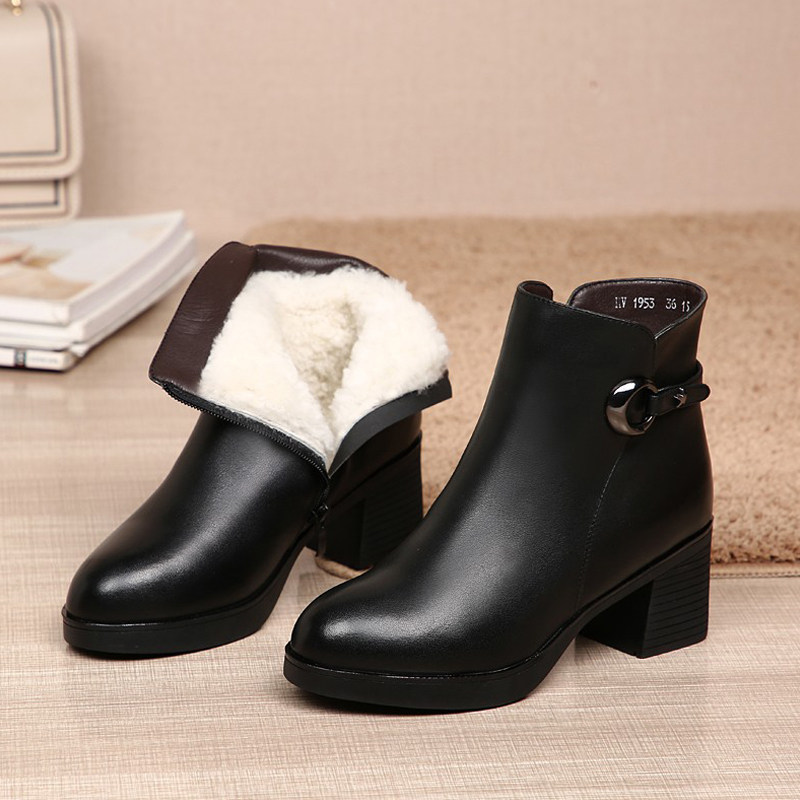 全牛皮羊毛鞋女子东北大棉鞋 女靴妈妈靴子加绒加厚皮鞋粗跟短靴