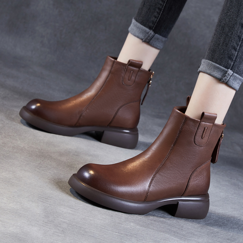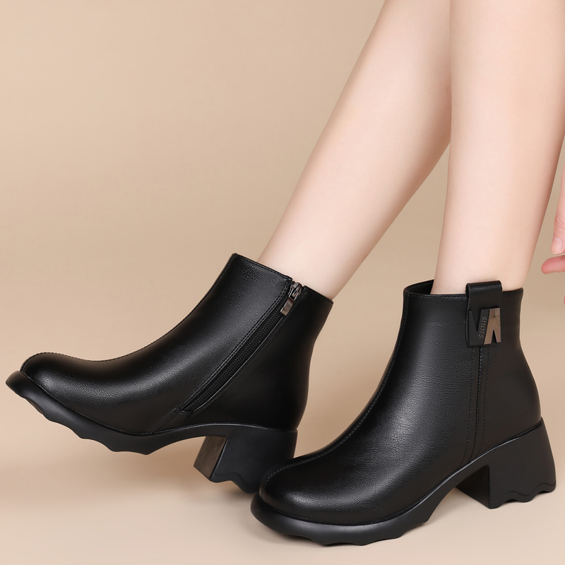 粗跟女士皮鞋中跟显瘦配大衣妈妈短靴女冬靴子防滑中年女子棉皮鞋