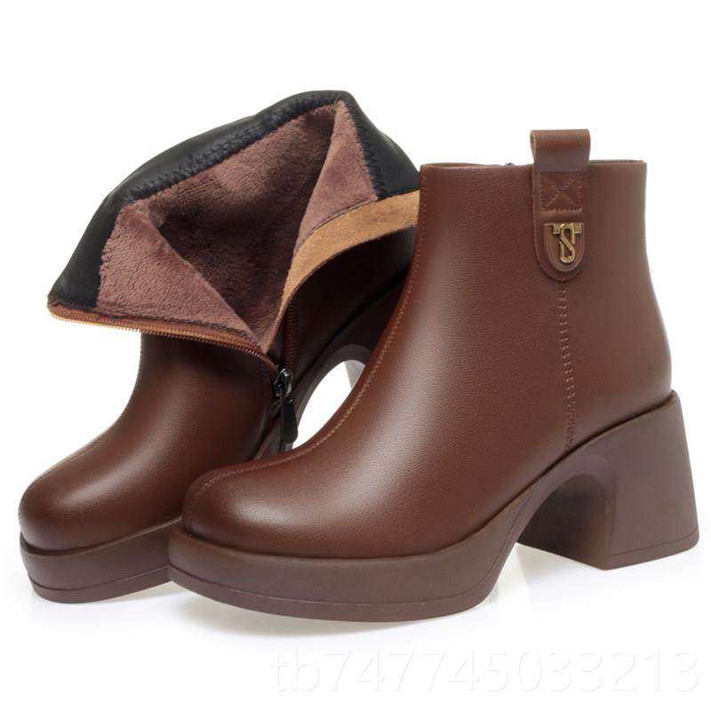 正品中年真皮高跟鞋女子短靴女个子靴子冬季加小绒妈妈羊毛棉鞋皮