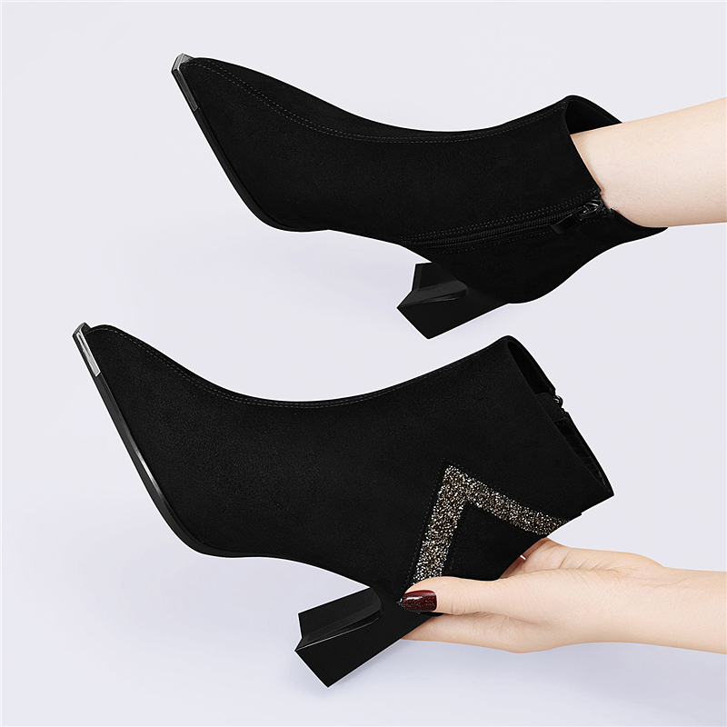 2025新款冬季尖头高跟短靴女靴子欧美潮绒面加绒粗跟女马丁靴女子