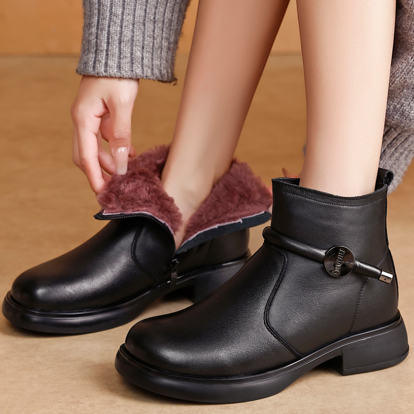 羊皮毛妈妈短靴粗跟软底真皮棉鞋冬款中年女子半跟皮鞋软皮棉靴子