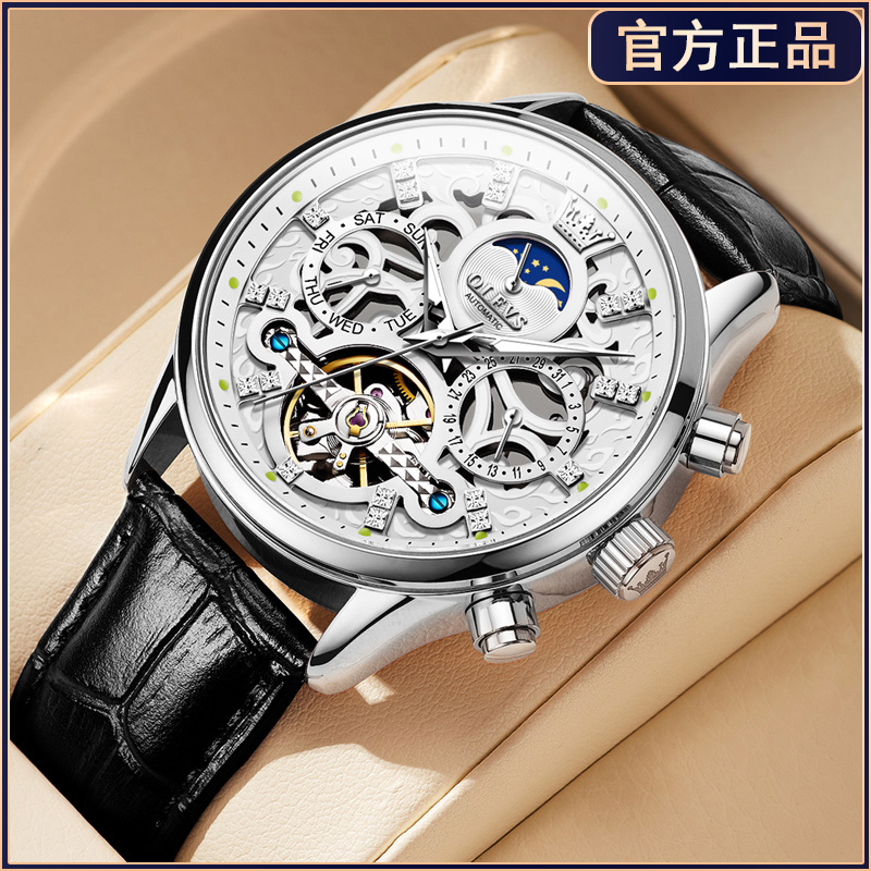 瑞士认证正品牌手表男士款全自动机械表真皮带日月相时尚潮流十大