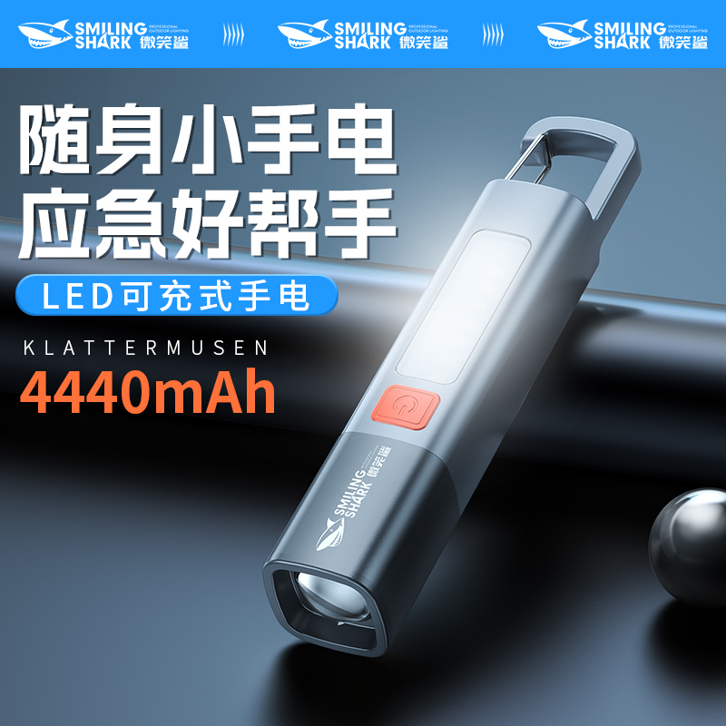 微笑鲨小手电筒强光充电超亮户外小型便携家用学生多功能迷你手电