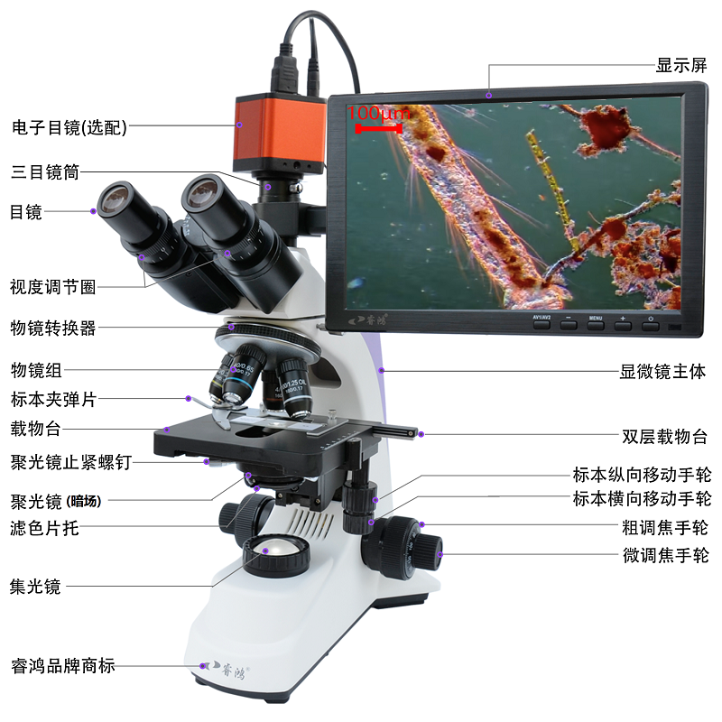 专业双目显微镜光学BM-500T高倍科研显示屏生物粉末颗粒测量细菌微生物睿鸿