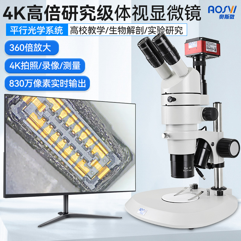 奥斯微4K三目体视显微镜光学专业测量0.8-8X大变倍高清光学显微镜ASV0880-HK830(含4K 28寸屏)
