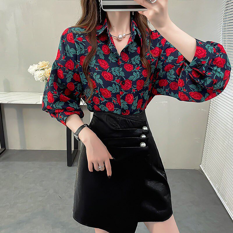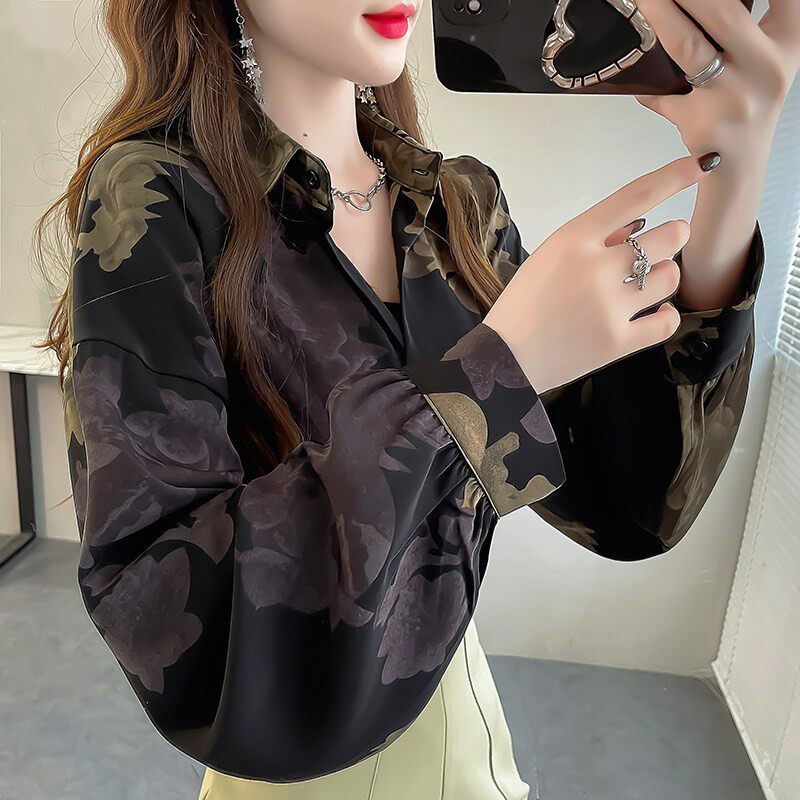 复古别致印花翻领衬衫女设计感小众衬衣宽松蝙蝠袖中长款春款上衣