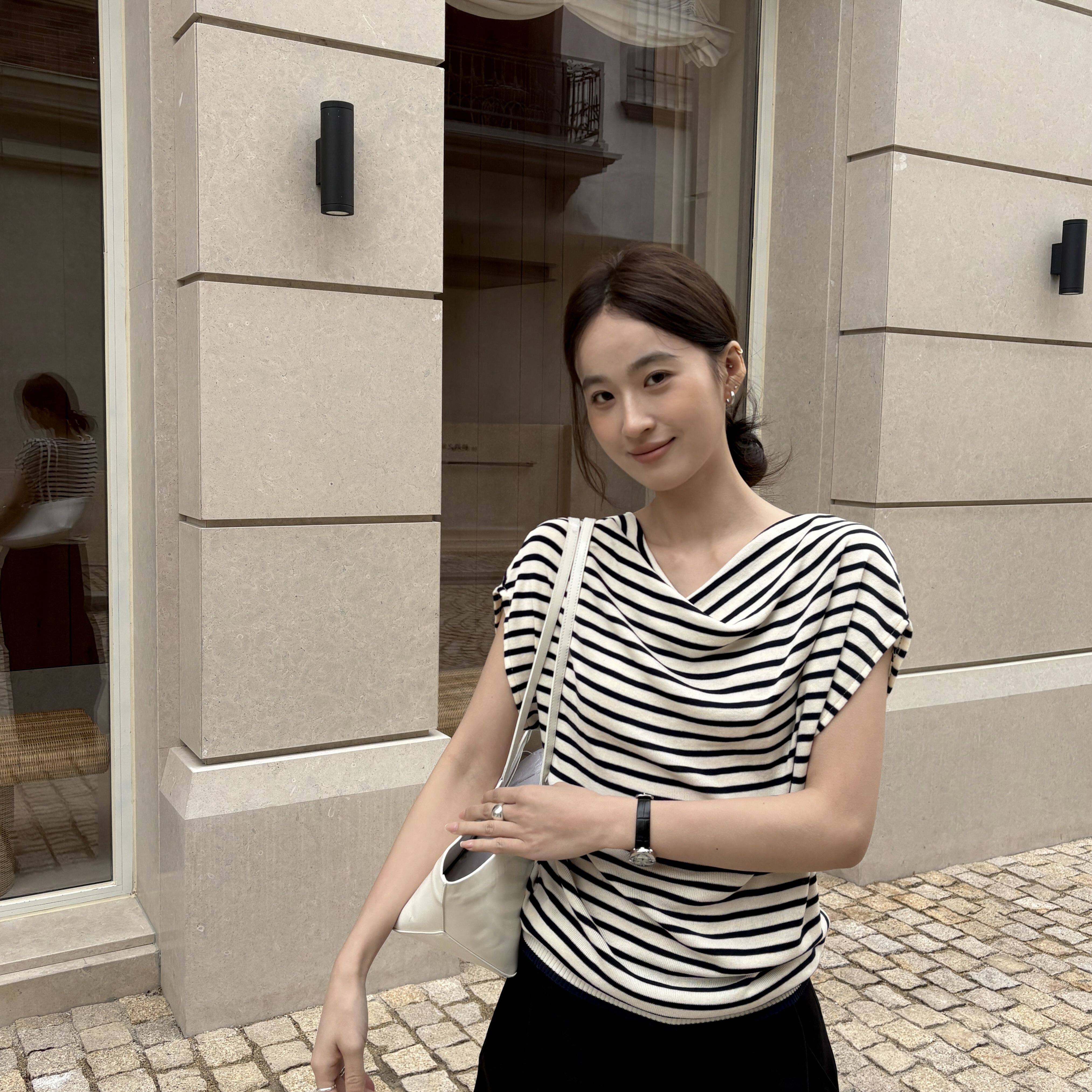 T.G-然垂落堆叠感26年春款不对称荡领蝙蝠袖斜肩露肩条纹针织小衫