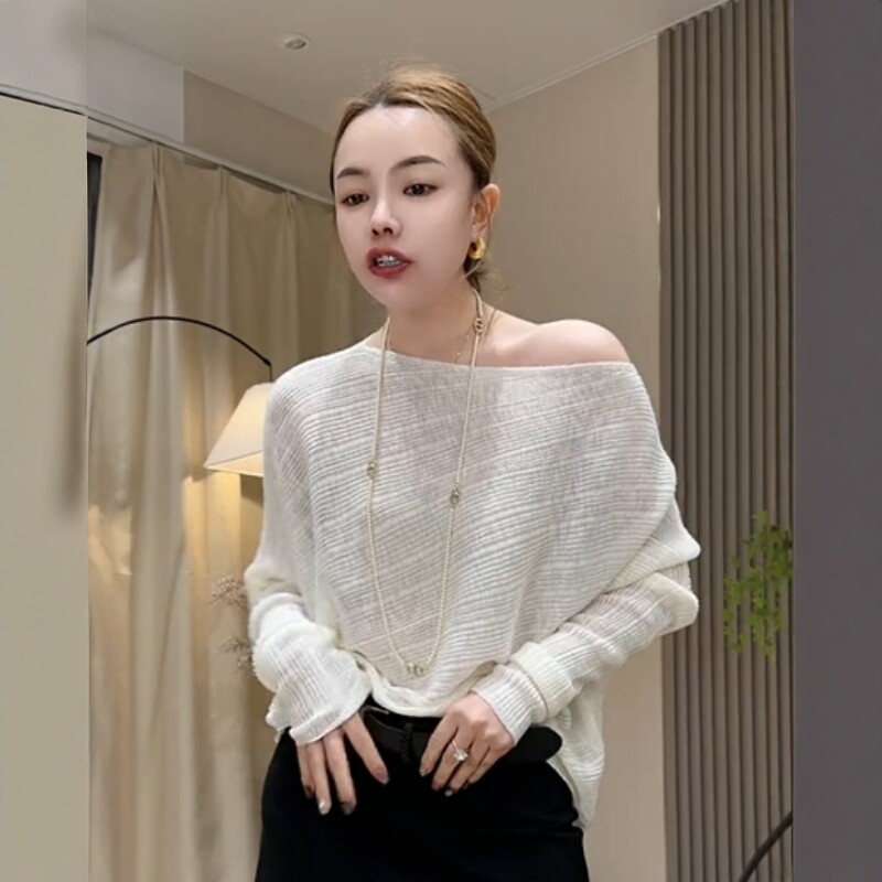 欧货斜肩露肩蝙蝠袖微透薄款宽松针织衫女设计感春款2026新款女装