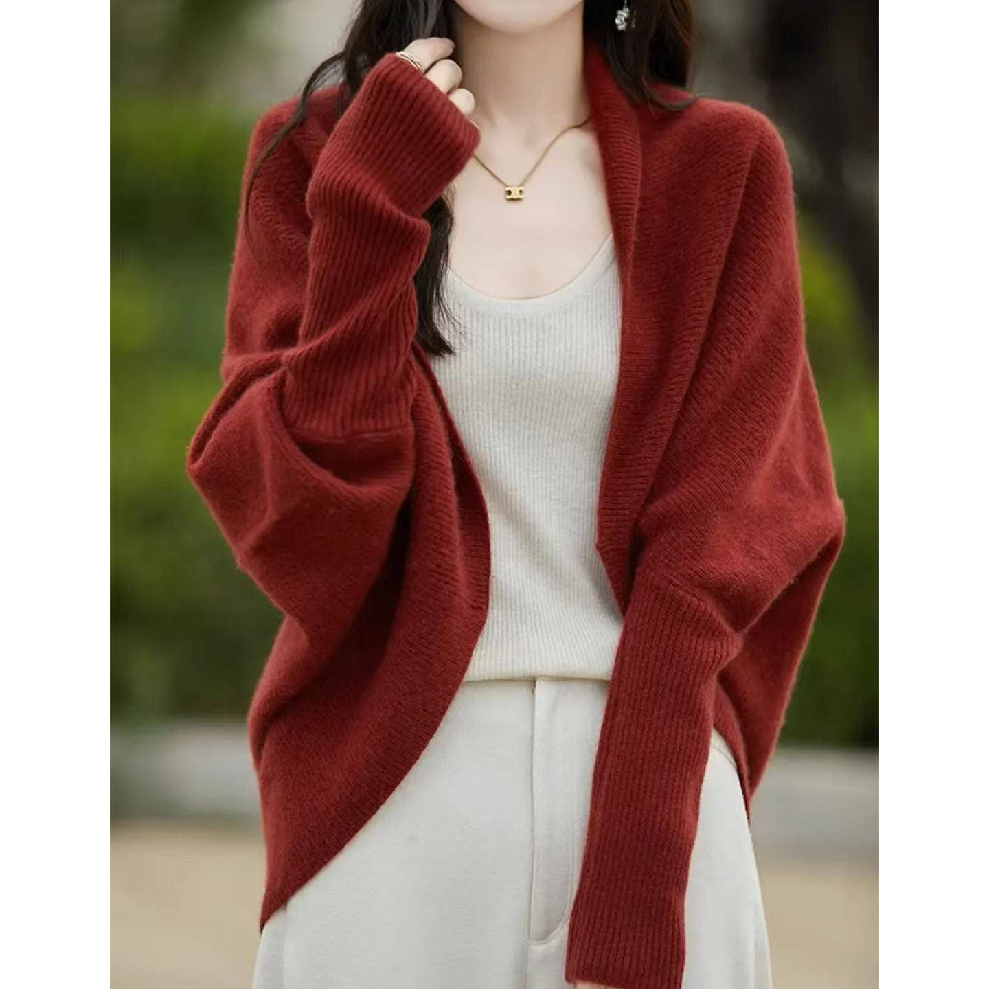 慵懒风蝙蝠袖V领开衫女砖红色针织毛衣外套宽松百搭2026春款上新