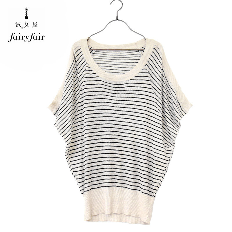 FAIRYFAIR正品杏色条纹圆领显瘦蝙蝠型宽松套头纯棉线针织衫春款