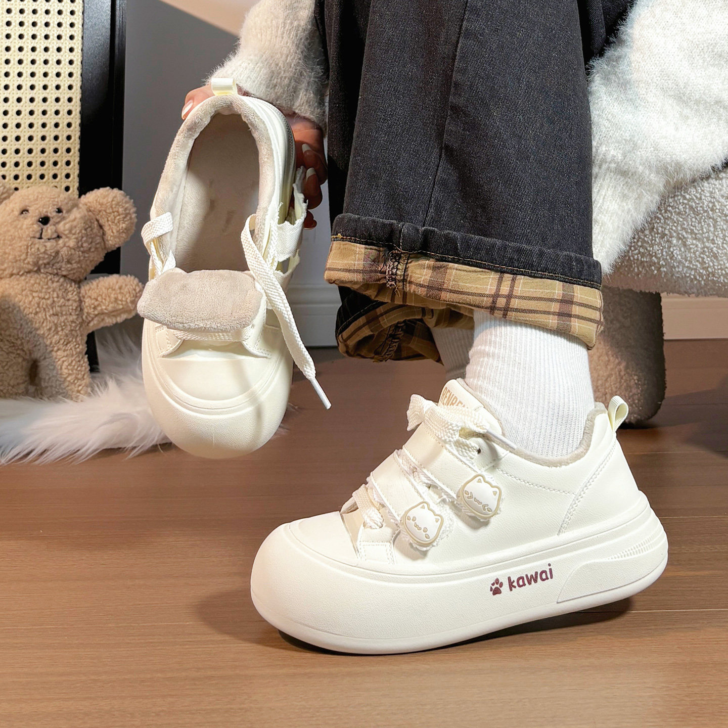 人本可爱小猫加绒小白鞋女冬季新款原创小众保暖二棉鞋学生大头鞋